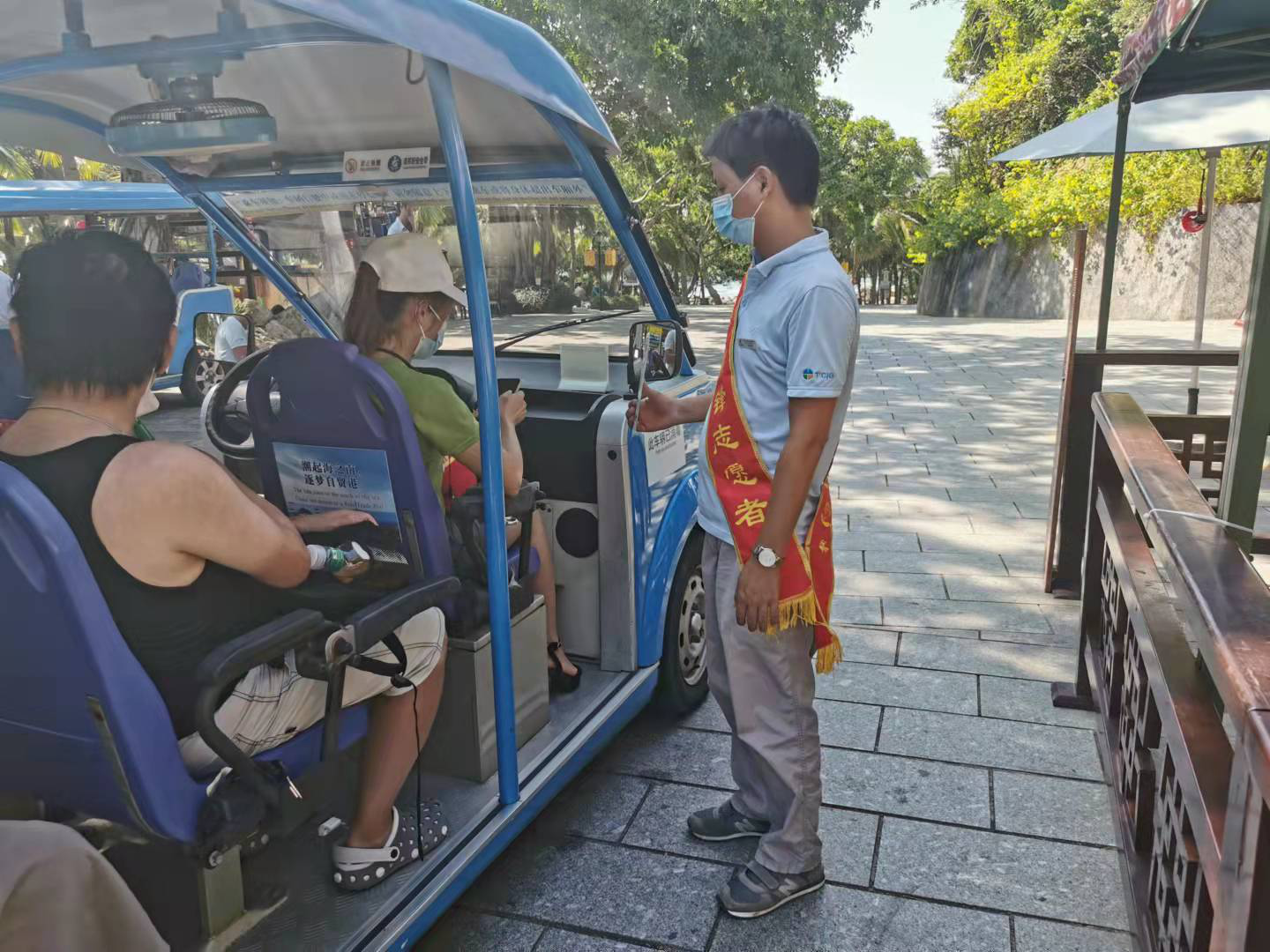 随着游客陆陆续续到达景区,为了减少人员聚集,减少游客排队购票时间,售票大厅外设置服务台,工作人员手把手指导游客网上订票,仔细耐心的接受咨询,让游客感受到“旅文人”的热情,消除初到景区的陌生感,处处都体现出景区热情好客、微笑迎宾的形象。