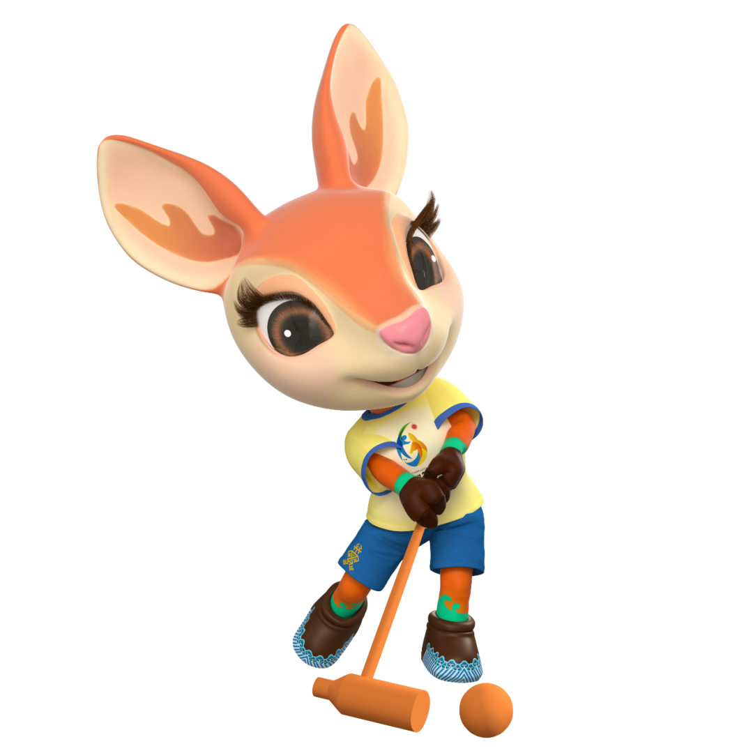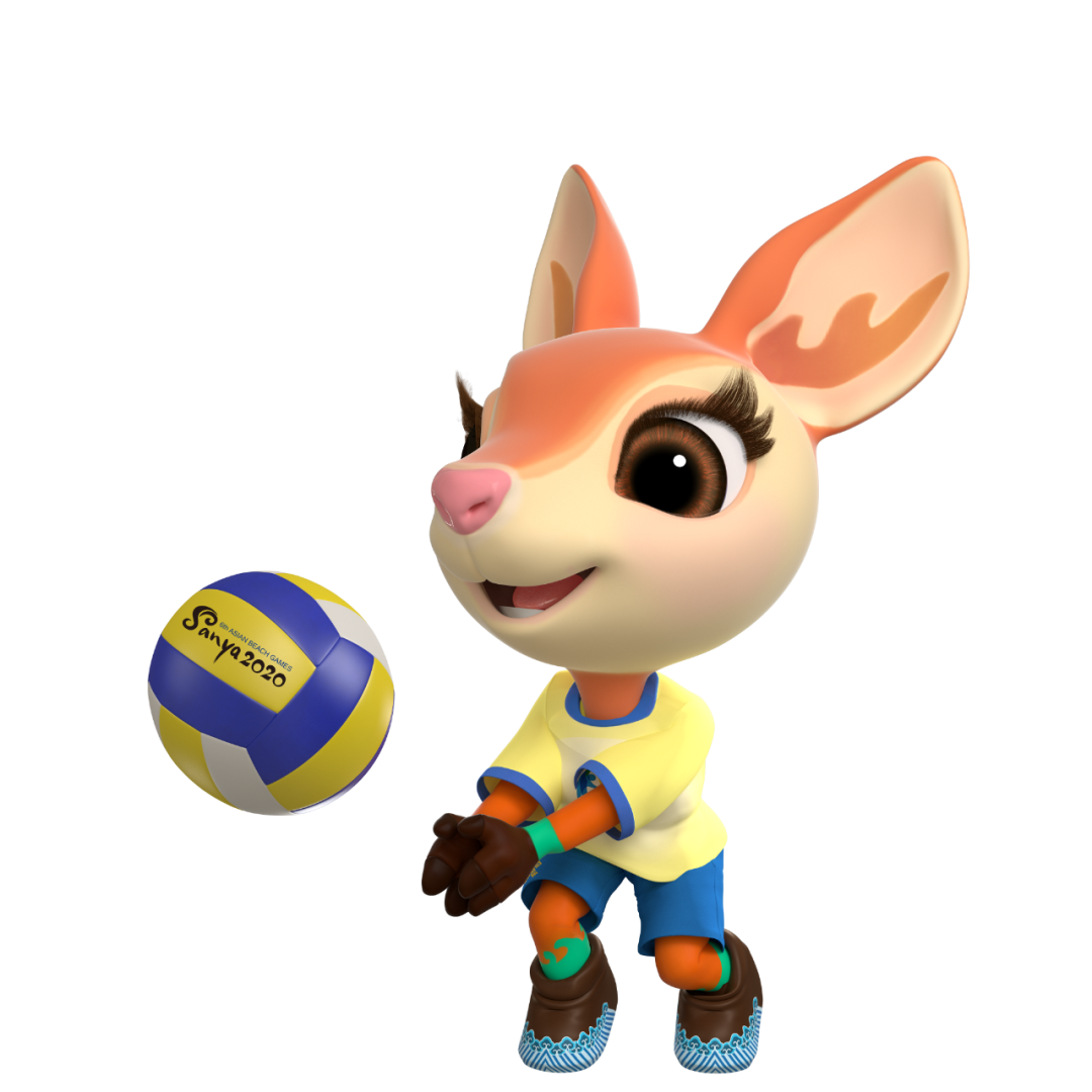 在吉祥物运动项目造型中,“亚亚”时而全神贯注、英姿飒爽,时而悠然自得、神采飞扬,用灵动的双眸、热情的笑脸、充满活力的运动姿态,表达“亚亚”热爱沙滩与水上运动、努力争夺荣誉的态度。