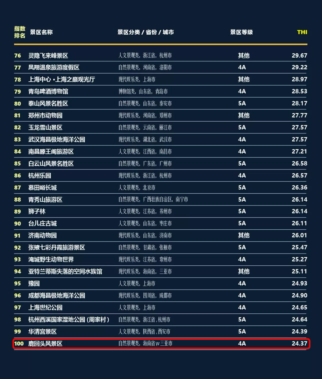 4月20日,由中国旅游景区协会和华侨城创新研究院联合研发编制的“中国旅游景区欢乐指数(THI)”正式发布。此次发布的指数包括“中国旅游景区欢乐指数(THI)排名前100名”和中国旅游景区自然景观类、人文景观类、博物馆类、乡村田园类、现代娱乐类等分类欢乐指数前20名,其中鹿回头风景区依依上榜。