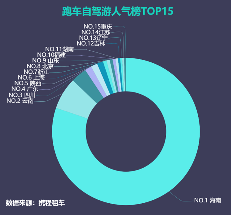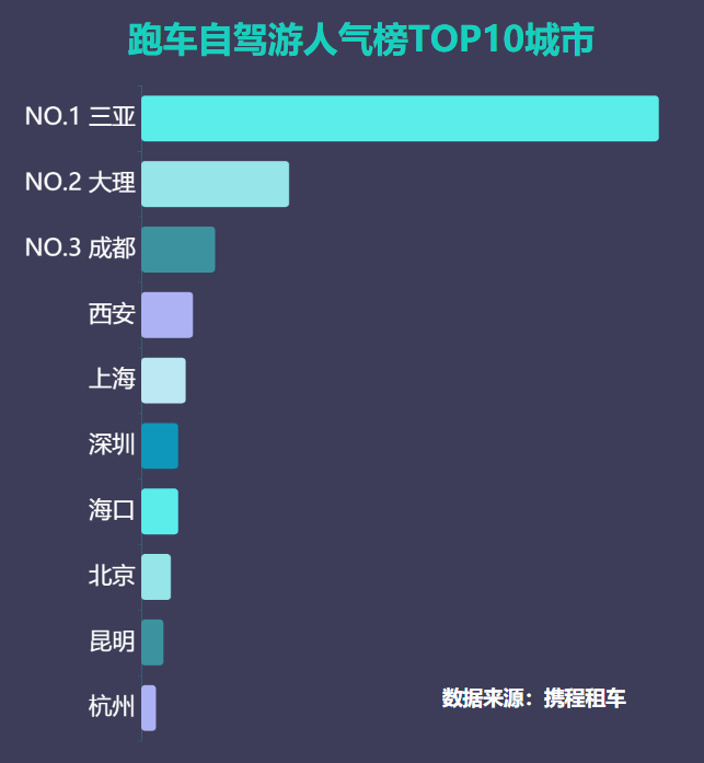 据携程统计数据显示,在近期全国租车订单中,海南一省就占了70%,远远超过其它省份,成为跑车自驾游第一省。海南跑车订单主要分布在三亚、海口、陵水,三亚占了绝大部分。此外,统计数据显示,三亚成为国内租车、租跑车人气城市“双料冠军”。携程租车发布“跑车自驾游人气榜TOP10城市”分别是:三亚、大理、成都、西安、上海、深圳、海口、北京、昆明、杭州。三亚以70%以上的占比位居全国第一,成为“跑车之都”。